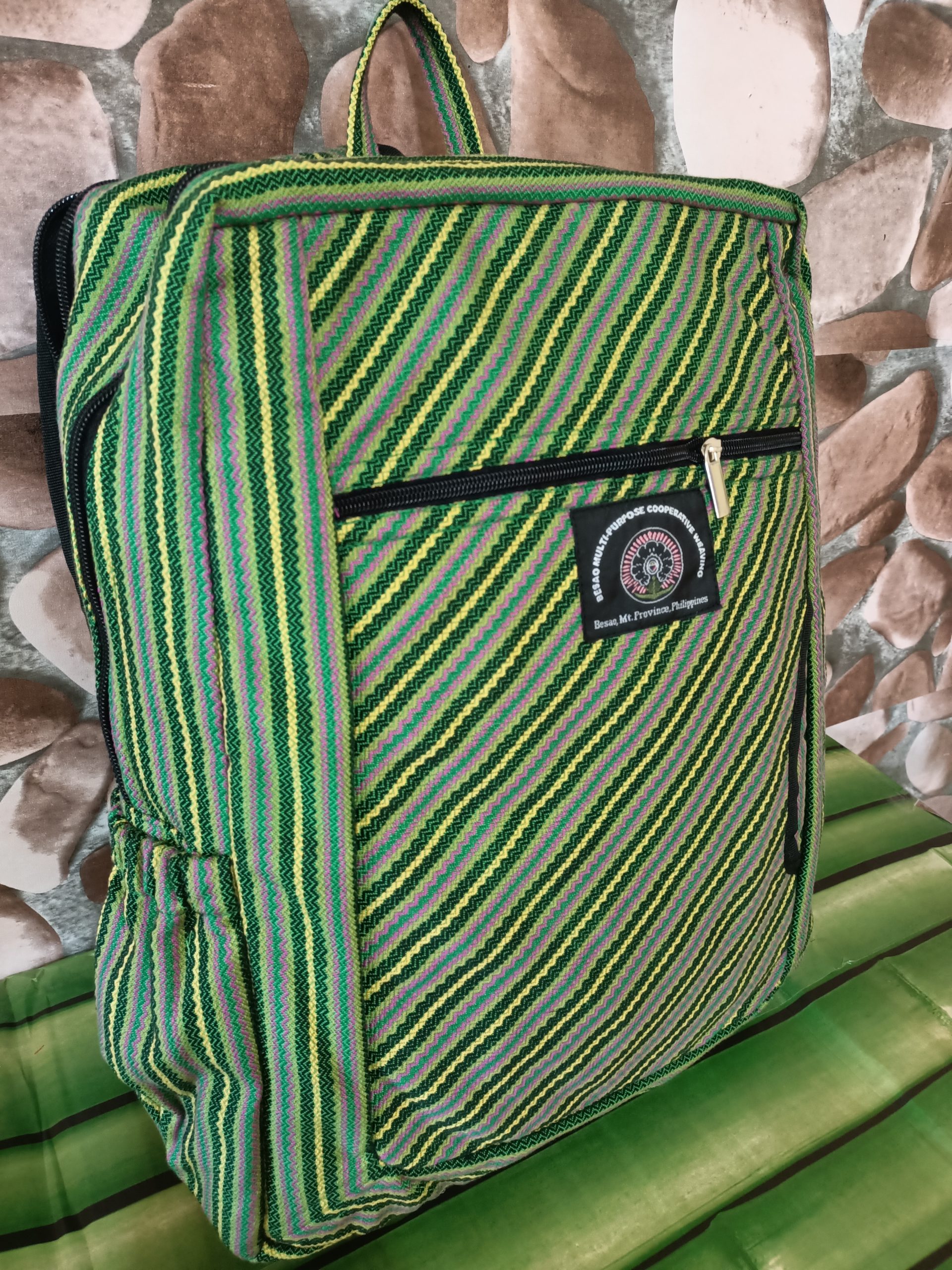 woven.  12″ length x 17″ height x 3″ width. can be used also as laptop bag