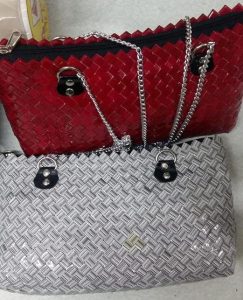 Ladies chic bag made from recycled woven foil chips wrappers. Zipper closure with metal chain.