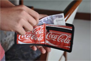Made from recycled juice or cola wrapper with one compartment for paper bills and coins slot.