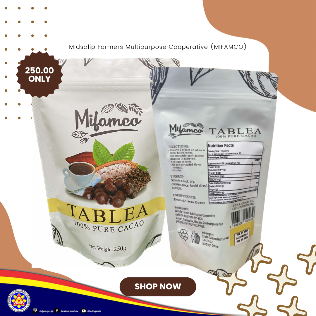 Mifamco Tablea is locally manufactured at Canipay Sur Midsalip Zamboanga Del Sur wherein 88 cacao farmers engaged in planting cacao.
